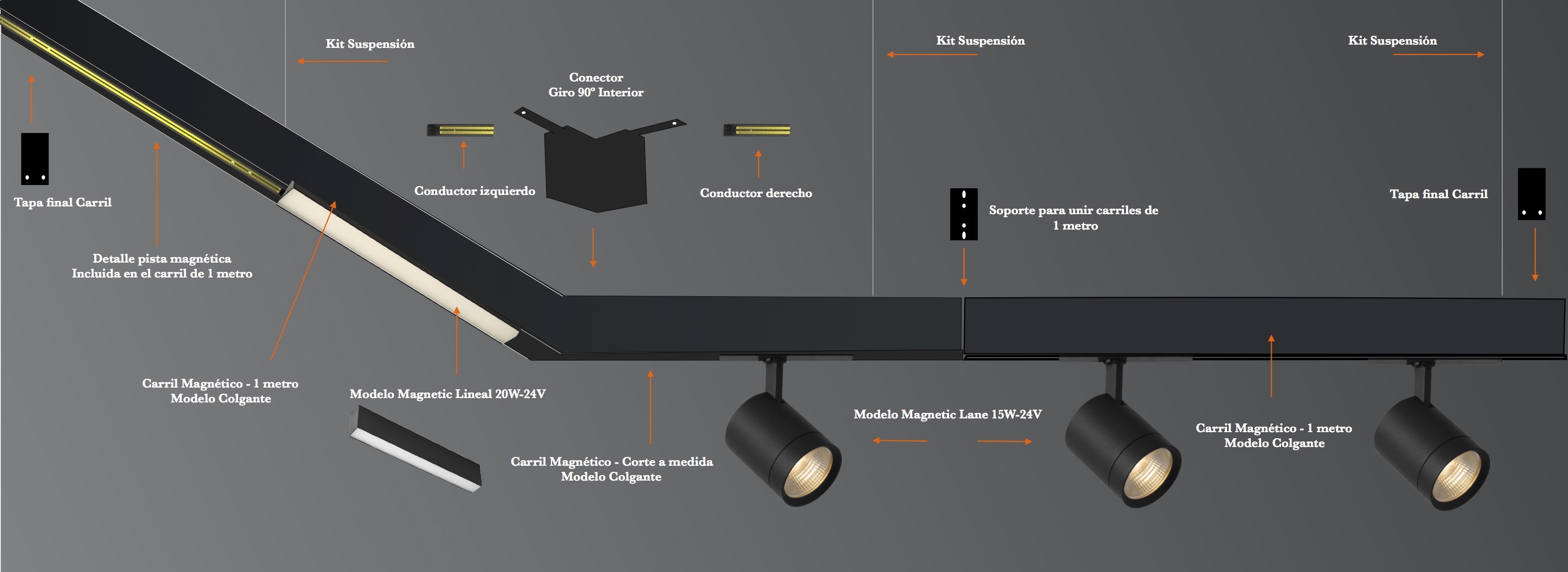 Accesorio en forma de L para unir carriles magnéticos. Para instalación en superficie o suspendida. Permite conectar dos tramos rectos en el mismo plano con un ángulo de 90º. Conector para unir los carriles magnéticos de 1 metro y dejarlos ensamblados de manera segura y firme.