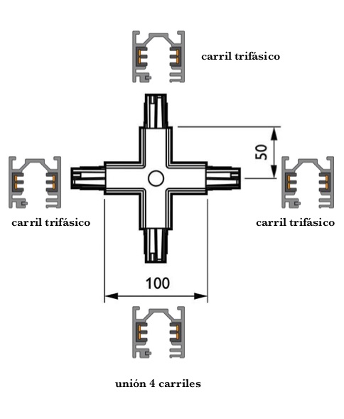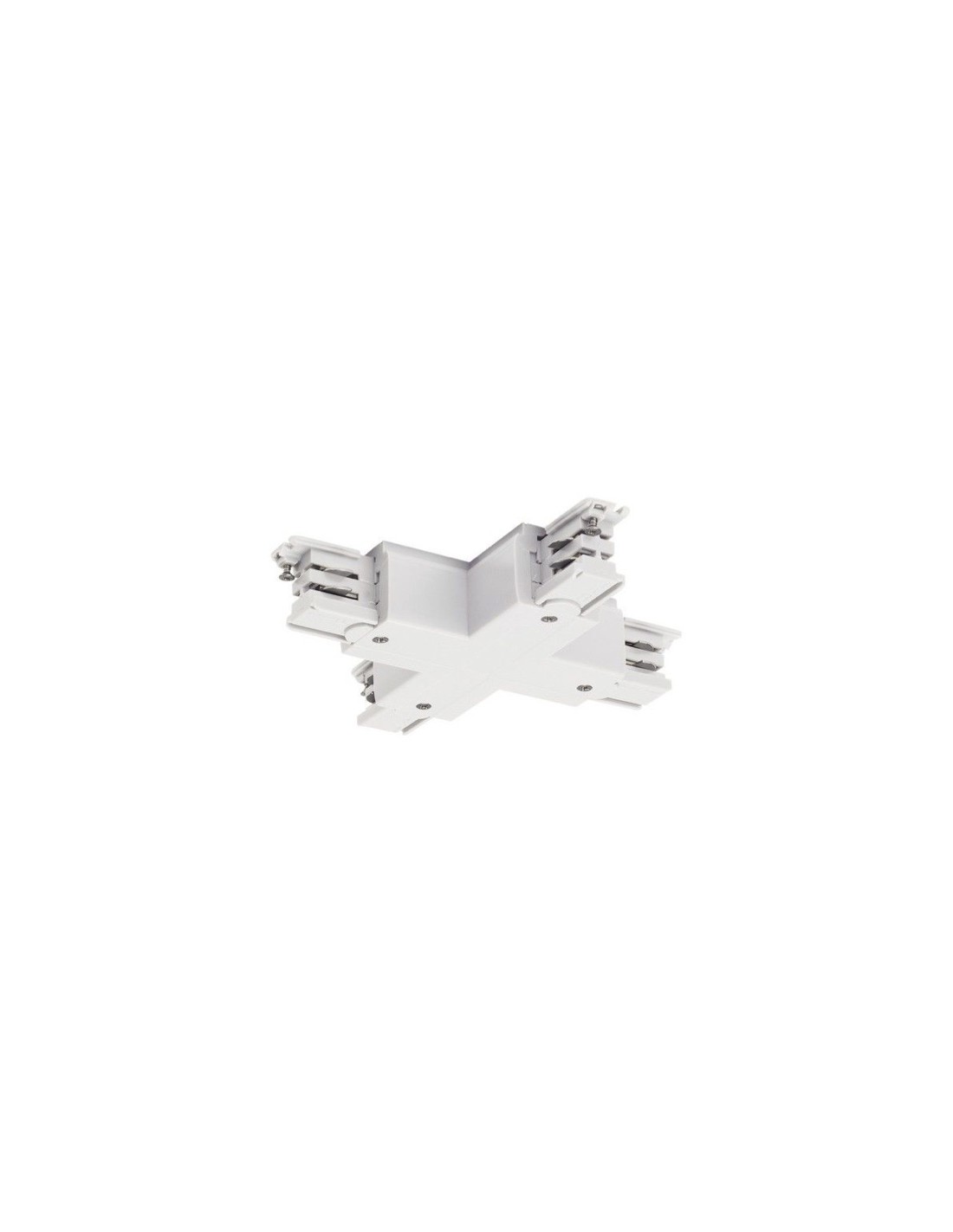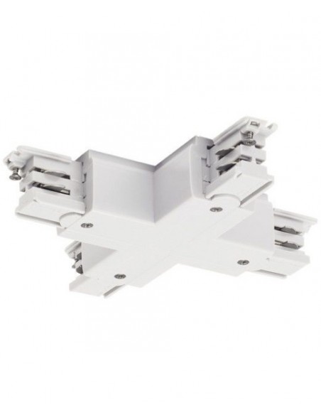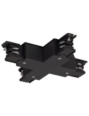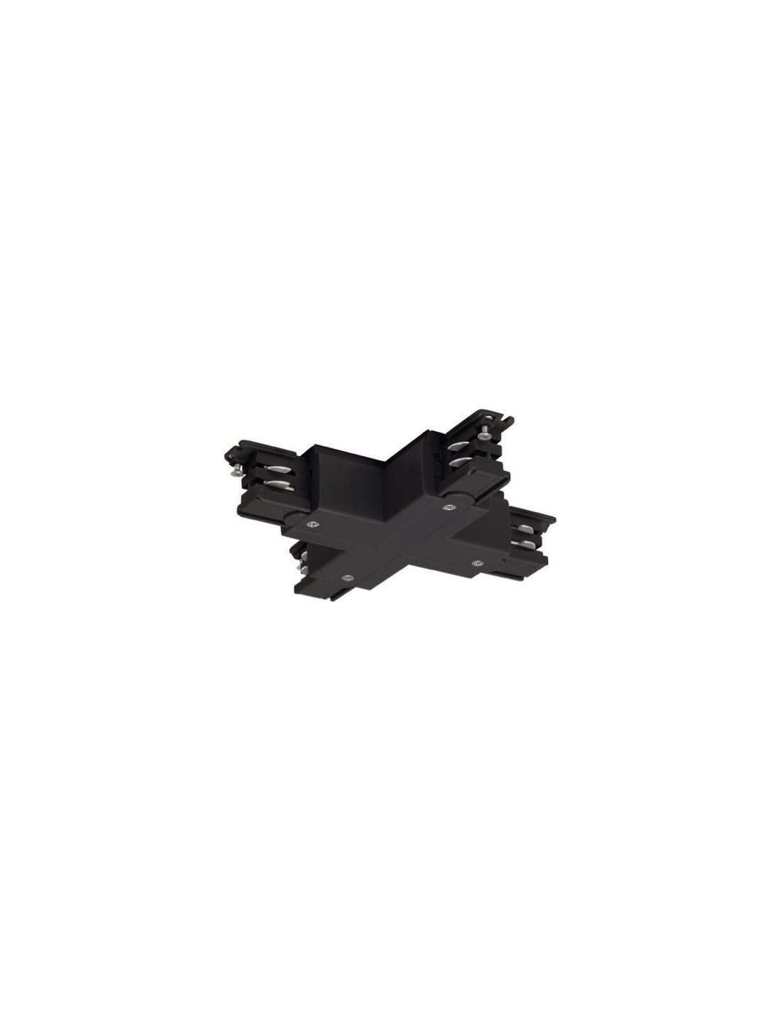 Conector en forma de X para unir y alimentar eléctricamente 4 tramos de carril.
