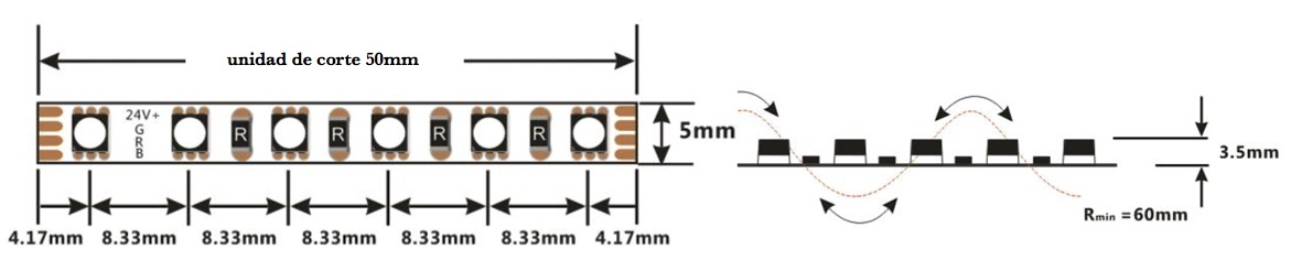 Verde | Azul | Dimensiones | Unidad Corte | LEDs/m | Distancia LEDs | Código |