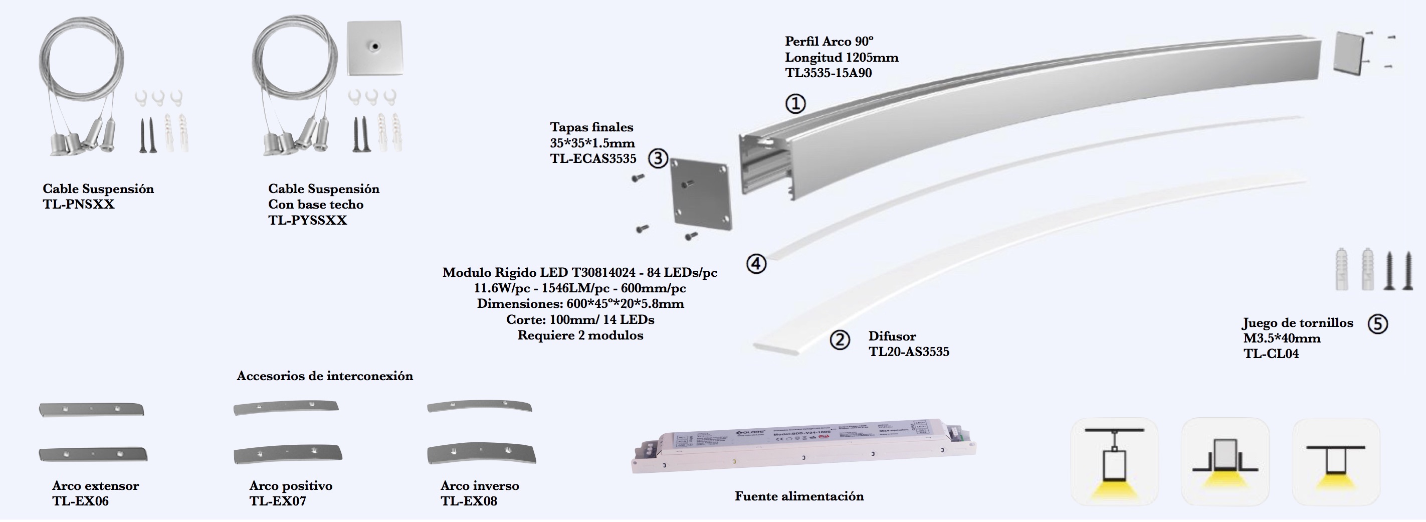 Perfil curvado de 90º con una longitud de 1205mm. Para generar multiples formas con plena libertad. Gracias a las conexiones de otros perfiles lineales y de arco. Material de alta calidad y tres colores opcionales: Plateado, negro y blanco. El difusor que necesita es totalmente flexible, facilitando su instalación.