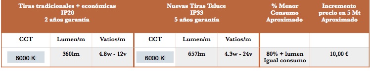 Una de las características por la que destaca este modelo; cuando comparamos con las tiras de LED tradicionales de potencia similar es que nos proporciona unos lumen muy superiores. En esta tabla puedes ver una comparativa.