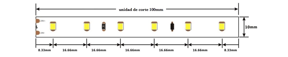 CRI Rango/w CCT K Lumen/m Lumen/w Dimensiones Unidad Corte LEDs/m Distancia LEDs Código