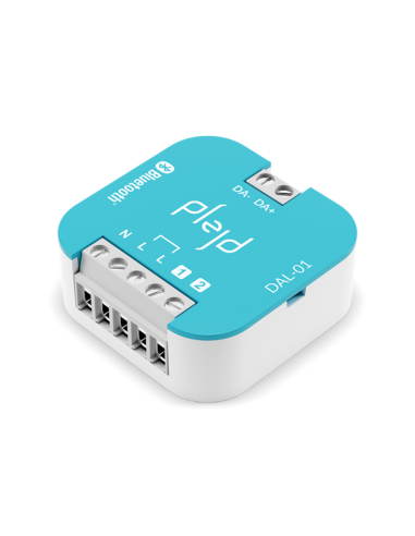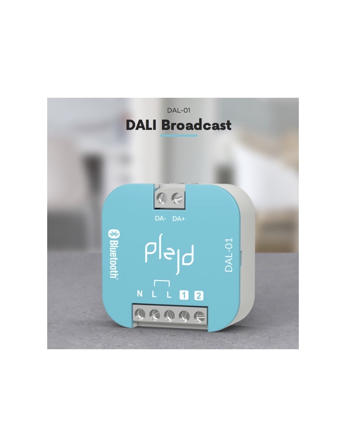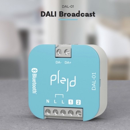 DALI Broadcast se utiliza para el control de transmisión de controladores y luces a través del bus DALI. El producto se puede controlar de forma inalámbrica a través de la aplicación o a través de otros productos de Plejd.