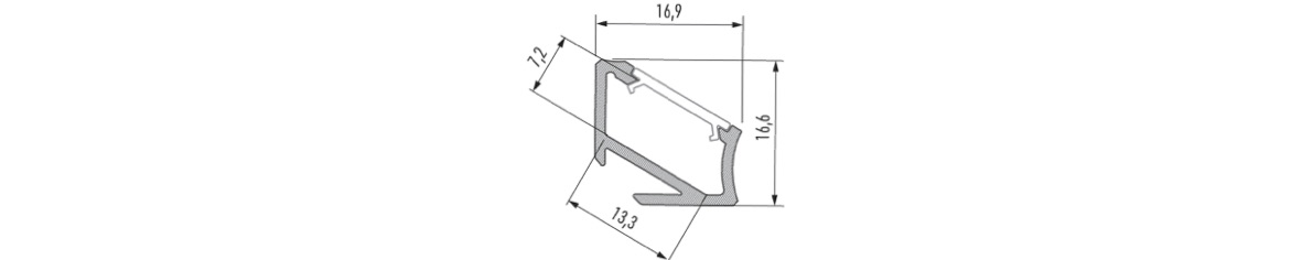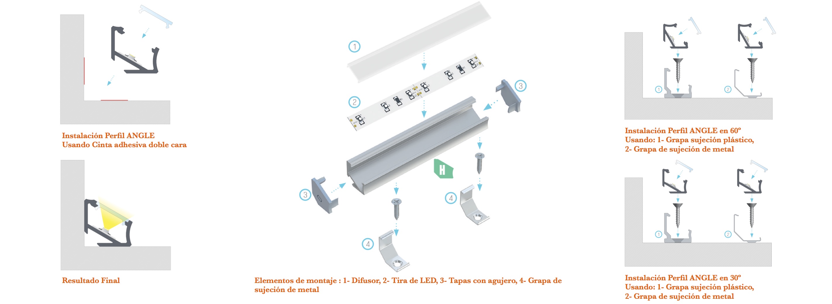 Perfil angular de 30º/60º. Para iluminar cocinas, armarios, escaleras. Es asimétrico. Permite conseguir diferentes ángulos de iluminación. Se pueden instalar hasta 1 Tira de LED de máximo 12mm de ancho. Material de alta calidad y cuatro colores opcionales: Plata, blanco, negro y cuero. Dispone de un amplio surtido de difusores.